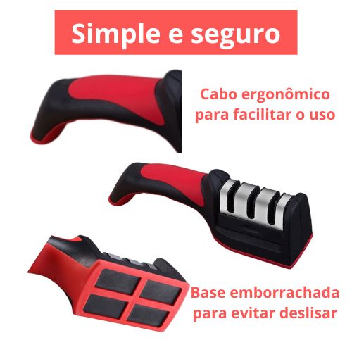 Seu cabo ergonômico e sua base oferecem conforto e segurança na hora de manusear além de ser resistente e compacto. E, seus três níveis de afiação proporcionam um fio de corte espetacular.